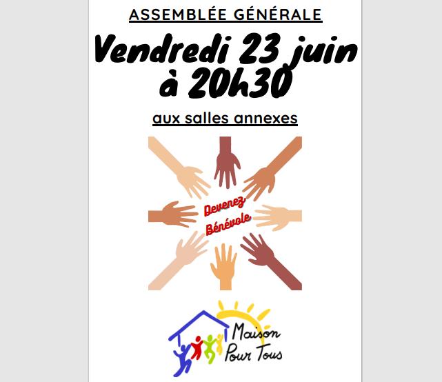 L'assemblée générale est l’occasion de faire le point sur les activités et les projets en cours. Votre présence sera aussi un encouragement pour les bénévoles et professionnels qui s’y investissent. Si vous le souhaitez, vous pouvez aussi vous porter candidat pour intégrer le conseil d'administration et participer pleinement à la vie de l'association. Ordre du jour : - présentation de la Maison Pour Tous, de ses activités, de ses projets - Rapport financier - Renouvellement du Conseil d'Administration