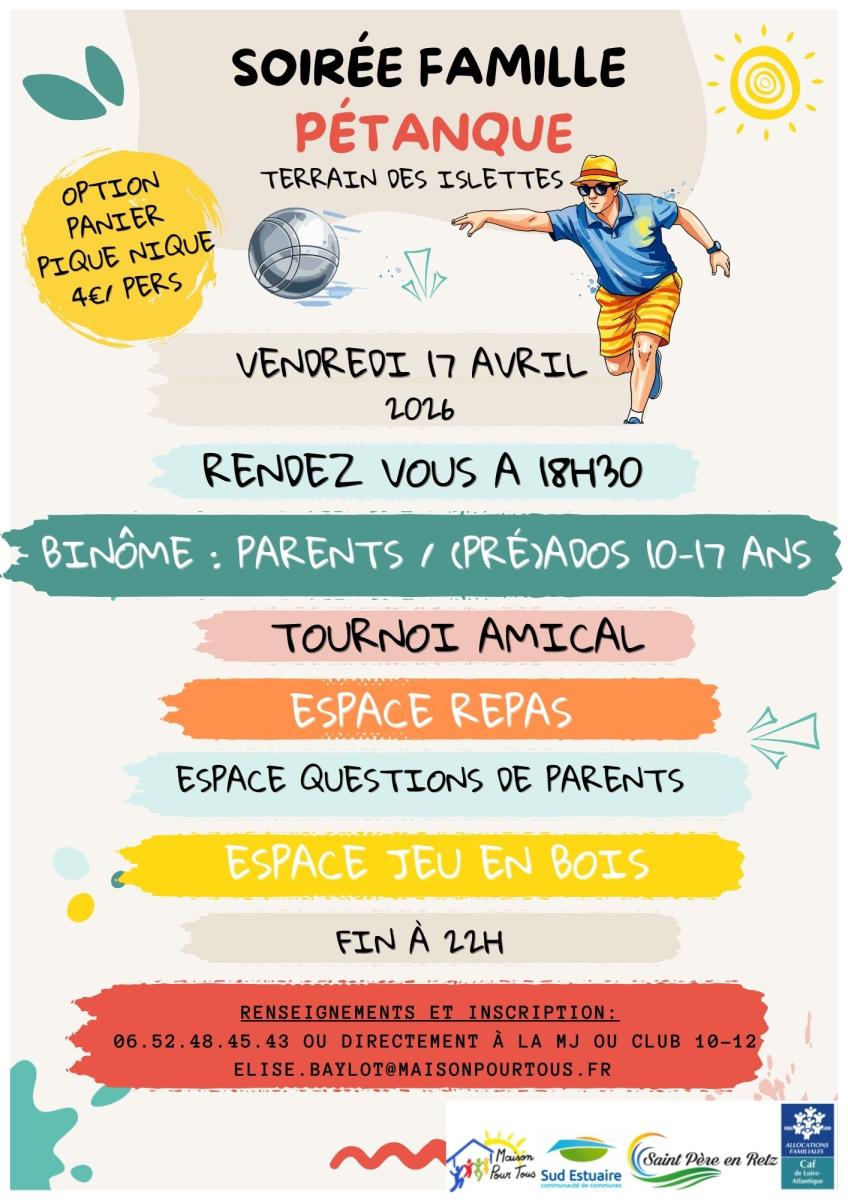Venez partager un moment convivial en famille lors de notre tournoi de pétanque en duo parent-enfant (10-17 ans) ! VENDREDI 17 AVRIL, de 18h30 à 22h.