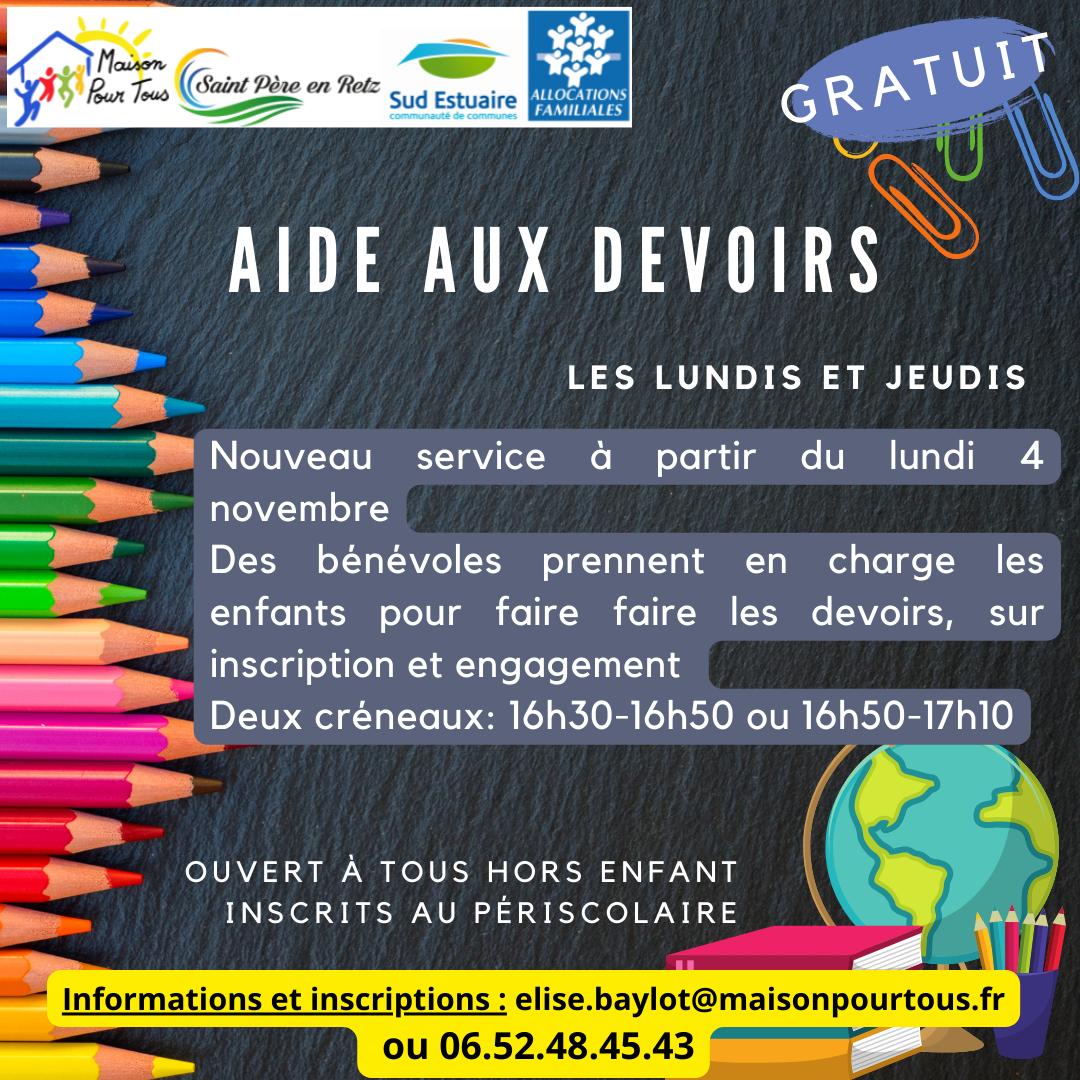 Au retour des vacances d'octobre, nous mettons en place un service d'aide aux devoirs pour les...
