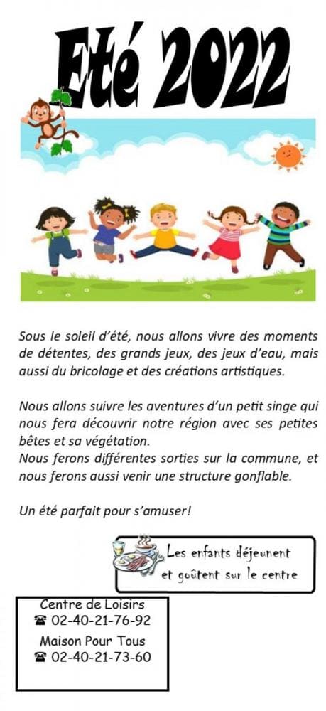 Sous le soleil d’été, nous allons vivre des moments de détentes, des grands jeux, des jeux d’eau, mais aussi du bricolage et des créations artistiques. Nous allons suivre les aventures d’un petit singe qui nous fera découvrir notre région avec ses petites bêtes et sa végétation. Nous ferons différentes sorties sur la commune, et nous ferons aussi venir une structure gonflable. Un été parfait pour s’amuser !